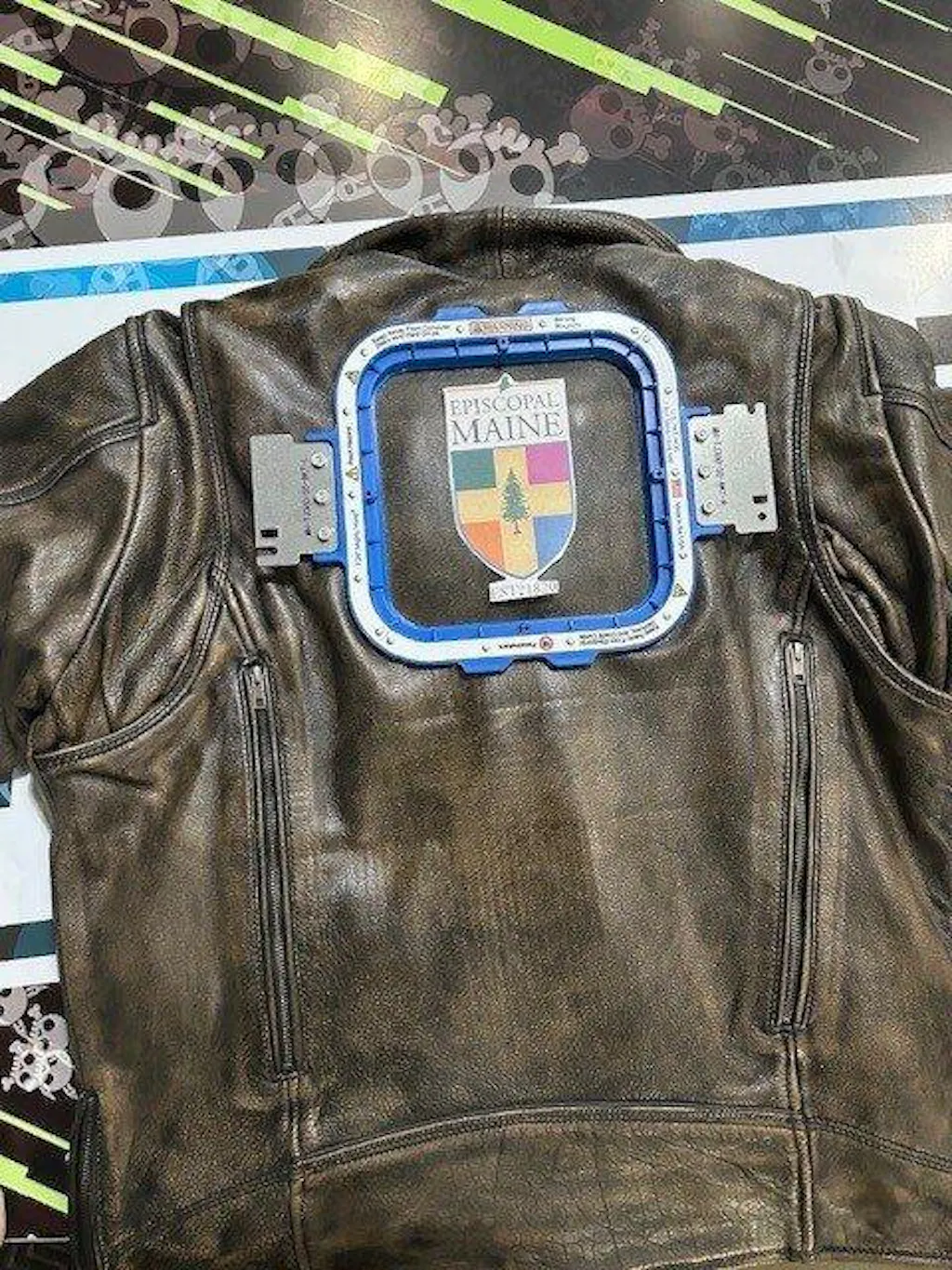 As our priest was gatting ready for retirement, we found out that he is also a motorcyycle enthusiast. We shopped for a jacket that would fit, woudl be reasonable in price, and would lend itself to a bit of emrroidery on the back. We opted to have the seal of the Episcopal Church in Maine added by a local trophhy company, and the results are pretty nice. We'll see what the reaction is tomorrow night at the retirement dinner. The photo below shows a mock-up, but I can tell you the final product looks great.