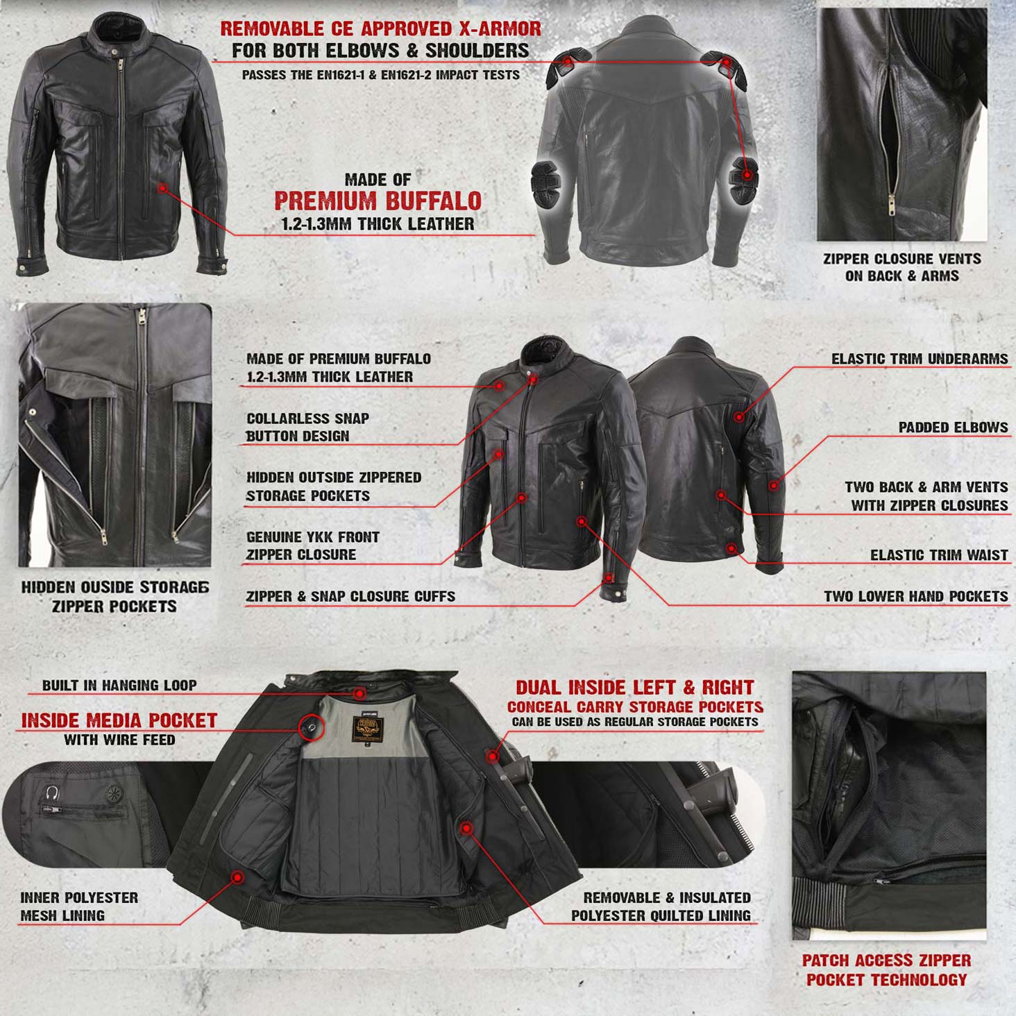 • Ventilation System: Front Upper Zipper Air Vents on Each Arm and Two Back Zipper Air Vents