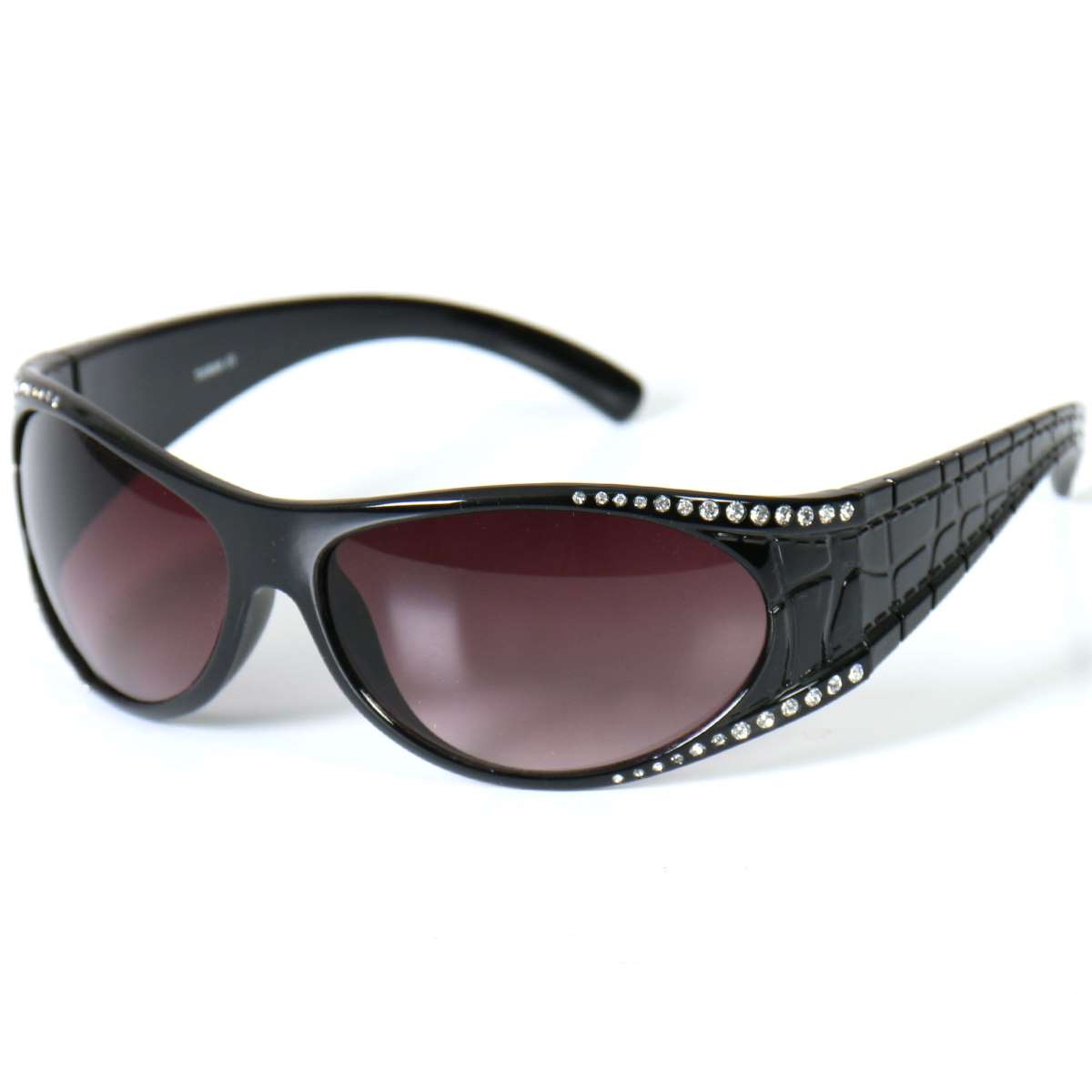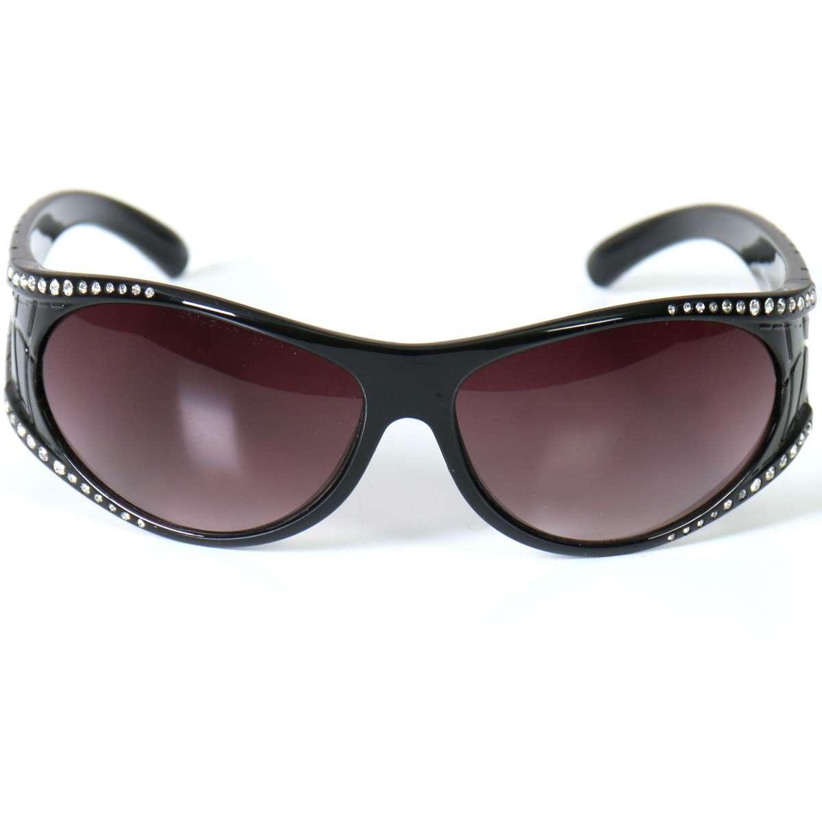 Marilyn Ladies Sunglasses are a must have for the biker who enjoys looking her best whenever she hits the road!  These aerodynamic shades offer a classic look with a modern twist!  Glossy black frame accented with rhinestone detail add unique style to these high-quality, durable sunglasses.  Contoured to eliminate light from all directions, the shatterproof polycarbonate UV400 filtered lenses provide the perfect protection during popular outdoor sports such as motorcycle and ATV riding, skateboarding, rollerblading, skydiving, shooting and just about any other extreme sporting activity where superior eye protection is important.   These sunglasses also contain smoke lenses with a distinctive gray tint, designed to decrease sunlight without distorting colors.  Order yours today!