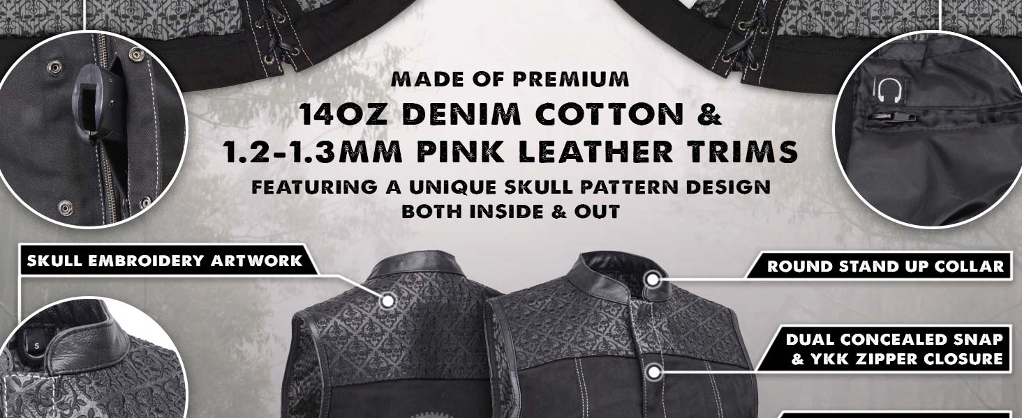 Milwaukee Leather MDL4052 Women's 'Skelly' Black Motorcycle Denim Vest w/ Skull Embroidery