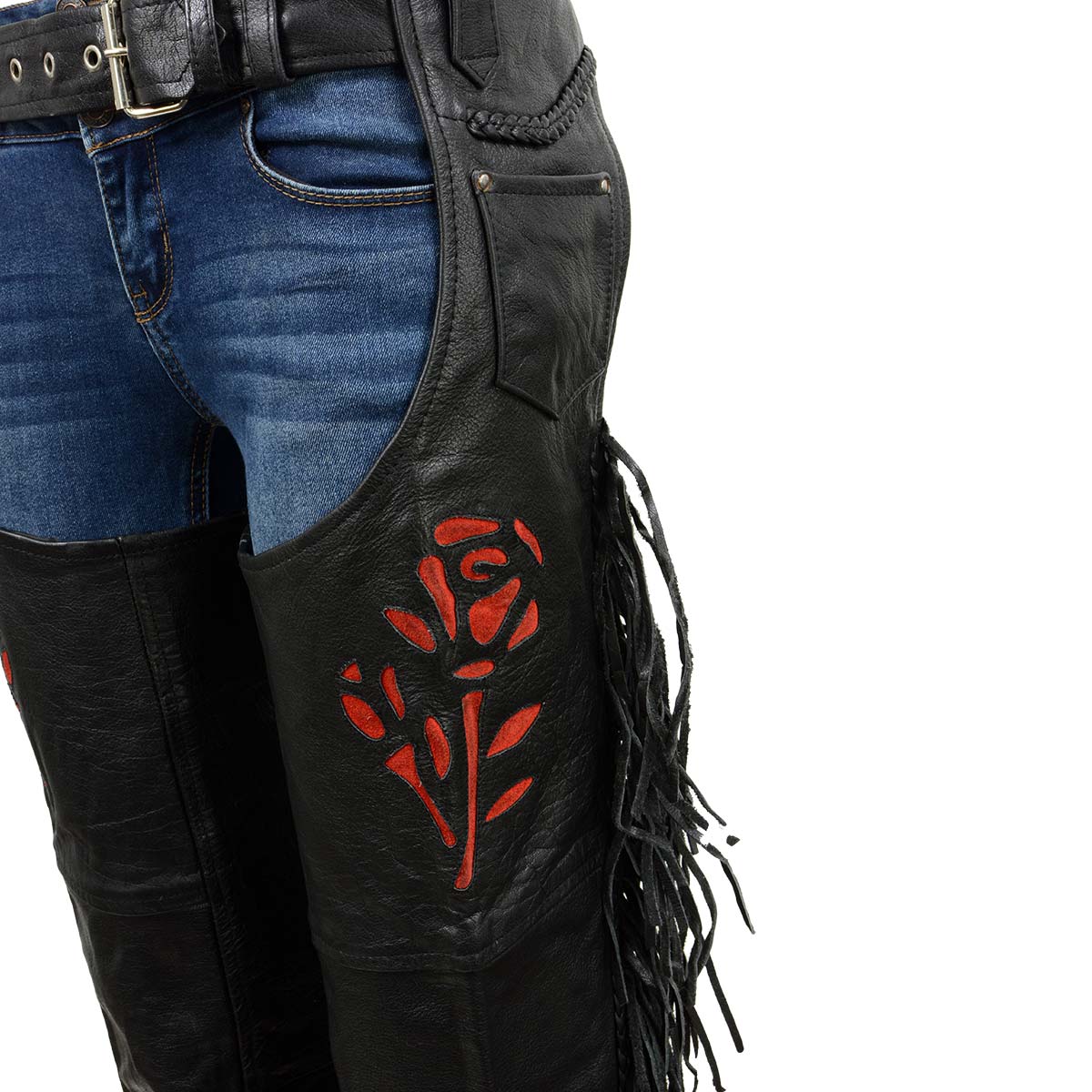 Milwaukee Leather SH1116 Women's Classic Braided & Fringed Black Leather Motorcycle Chaps w/ Red Rose Embroidery