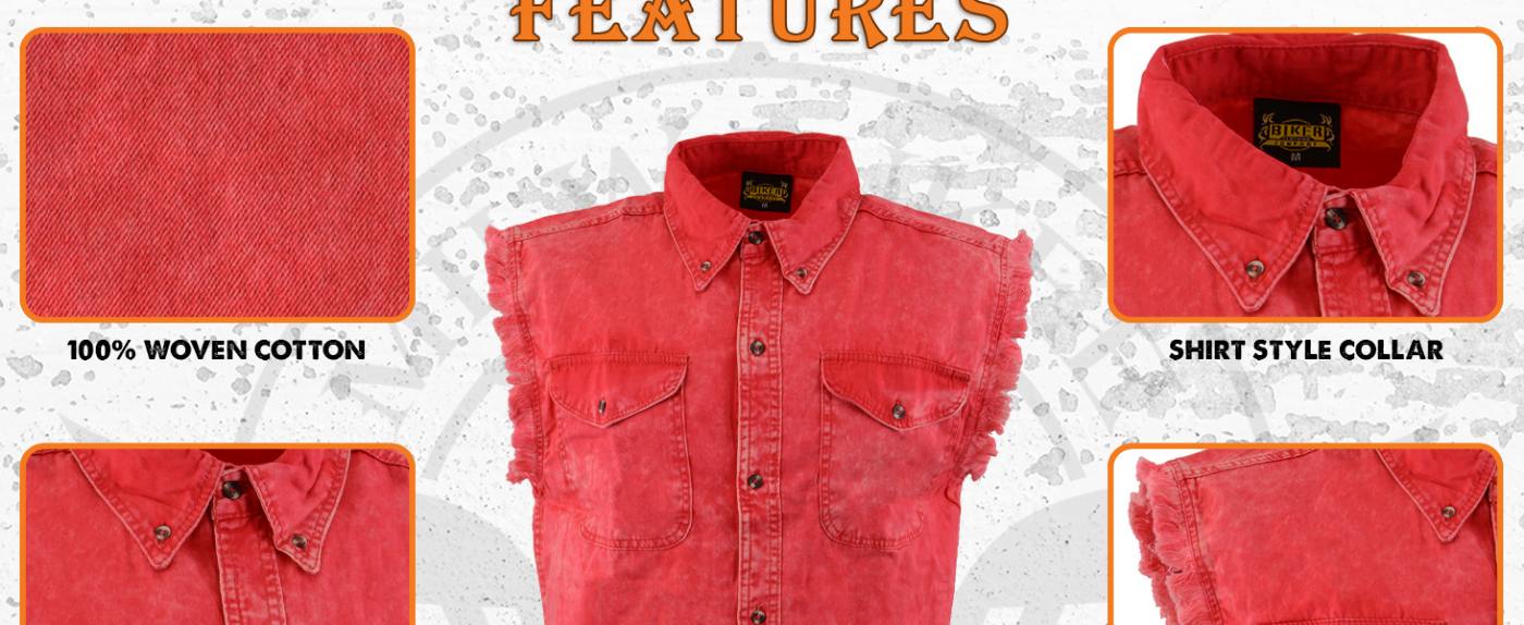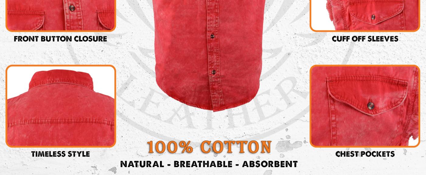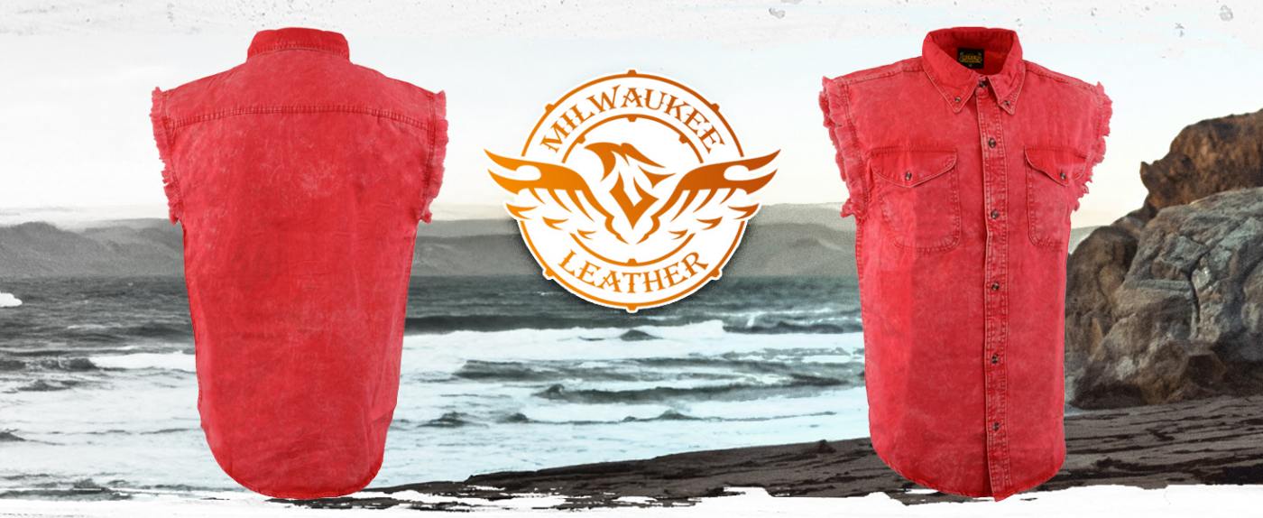 Milwaukee Leather DM4007 Men's Red Lightweight Denim Shirt with Frayed Cut Off Sleeveless