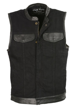 Club Vest CVM3010 Men's Black Denim Vest with Leather Trim Accents and Inside Gun Pockets