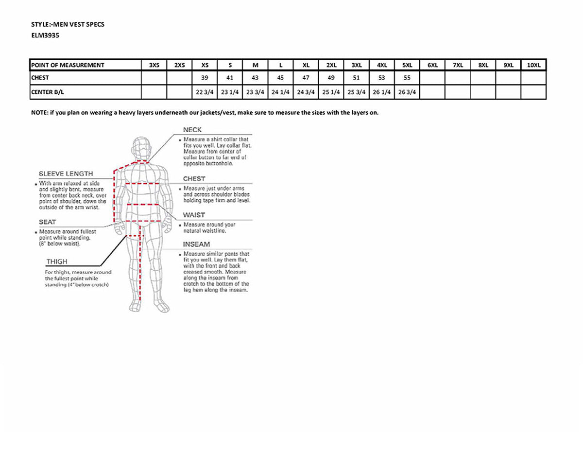 The ELM3900 is a wonderful vest. The size chart was very helpful. I got a small. I’m 150lbs with a 40in chest. It fits well. Slightly loose on warm days so it’s not too hot and works well with a hoody when it’s cool. I bought it with the Indian head because I ride an Indian Scout Bobber. I’m enjoying it.