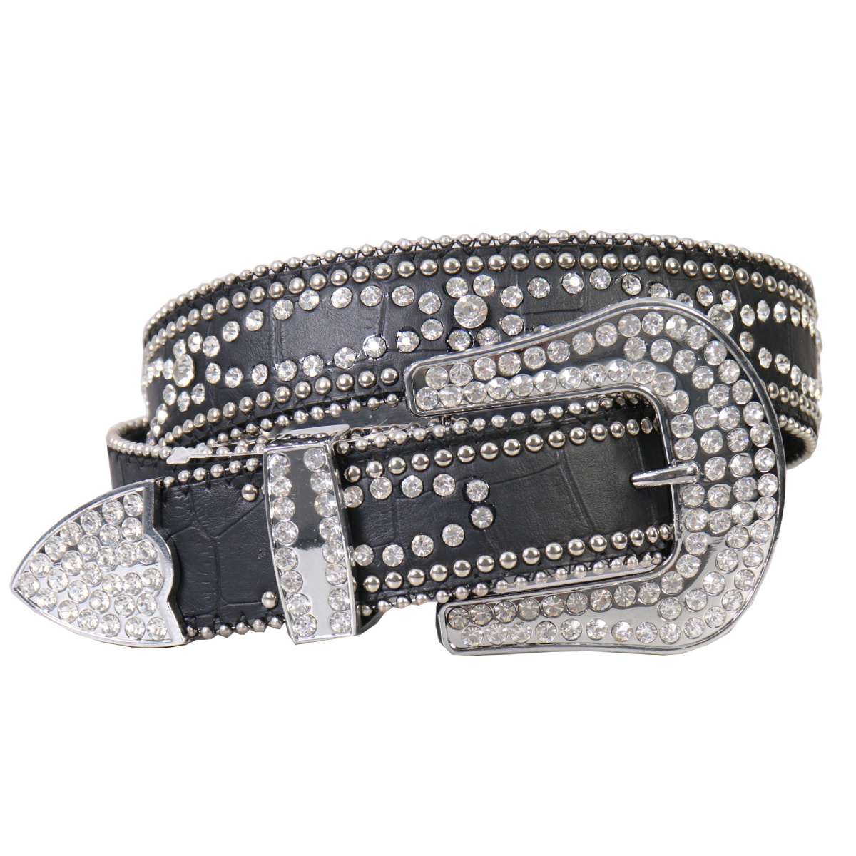 This one of a kind belt is designed for the biker who cannot resist a little bling! A black leather belt designed with small metal studs and rhinestones arranged in an oval pattern with removable rhinestone covered belt buckle.