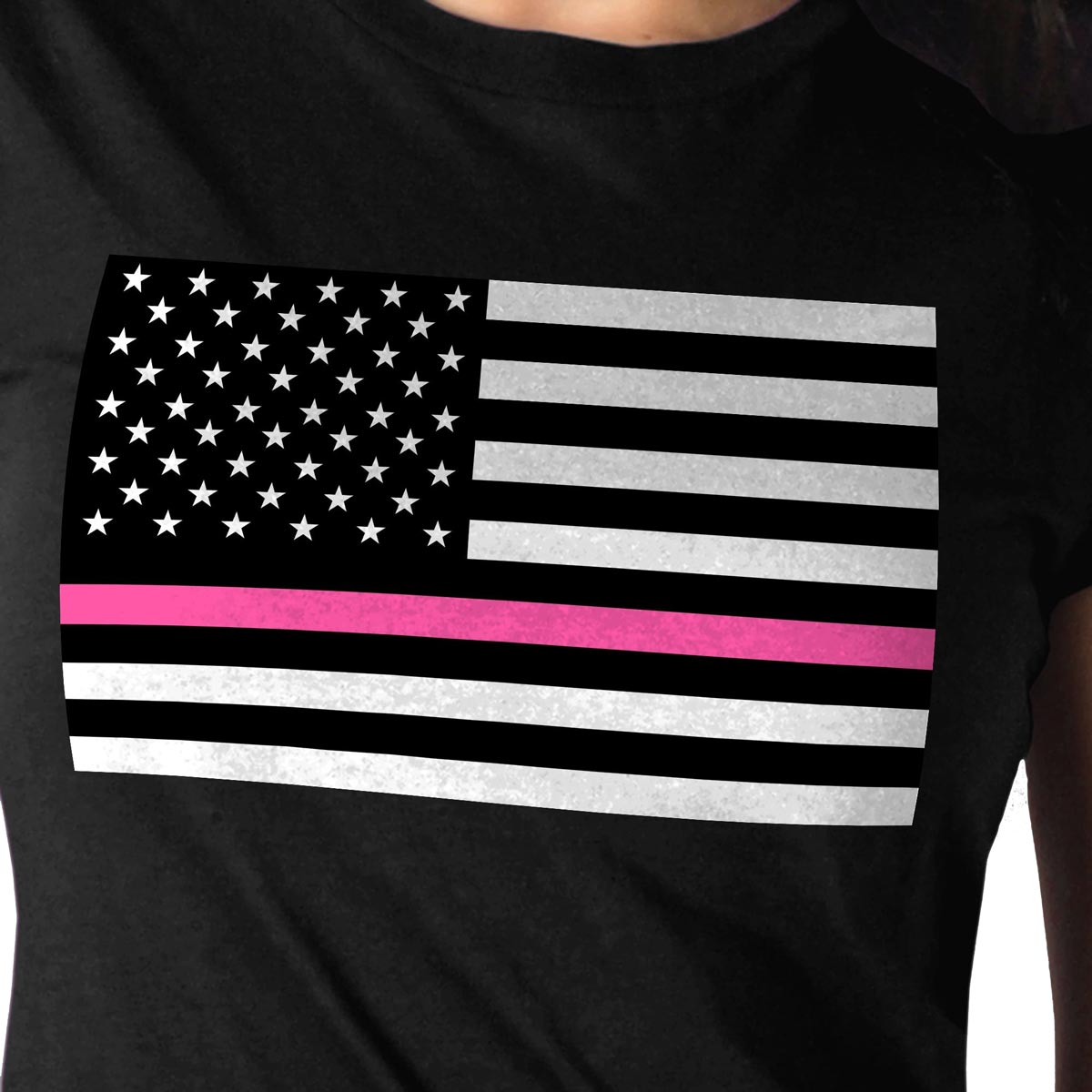 This ladies shirt in the color black features a screen printed thin line American flag in pink and silver. Get yours today!