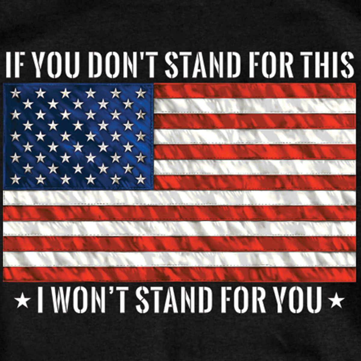 This men's t-shirt in the color Black features a screen printed image of the American flag with white text stating "IF YOU DONT STAND FOR THIS, I WONT STAND FOR YOU" .
