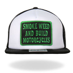 Hot Leathers Trucker Hats Are Made Of 5 Panel Quality Construction Featuring an Original Hot Leathers Patch on The Front. Each One Is Adjustable with A Flat or Curved Bill and A Mesh Back with A Snap Closure. This Hat Has an Embroidered Smoke Weed and Build Motorcycles Located on The Front Panel.