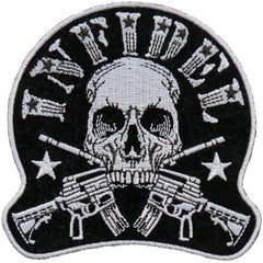 This Hot Leathers® original patch in size 4" x 4" features a skull with two rifles crossed beneath The text "INFIDEL" is displayed just above the skull.