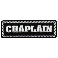Chaplain embroidered patch in black and white has heat sealed backing for easy iron-on application.