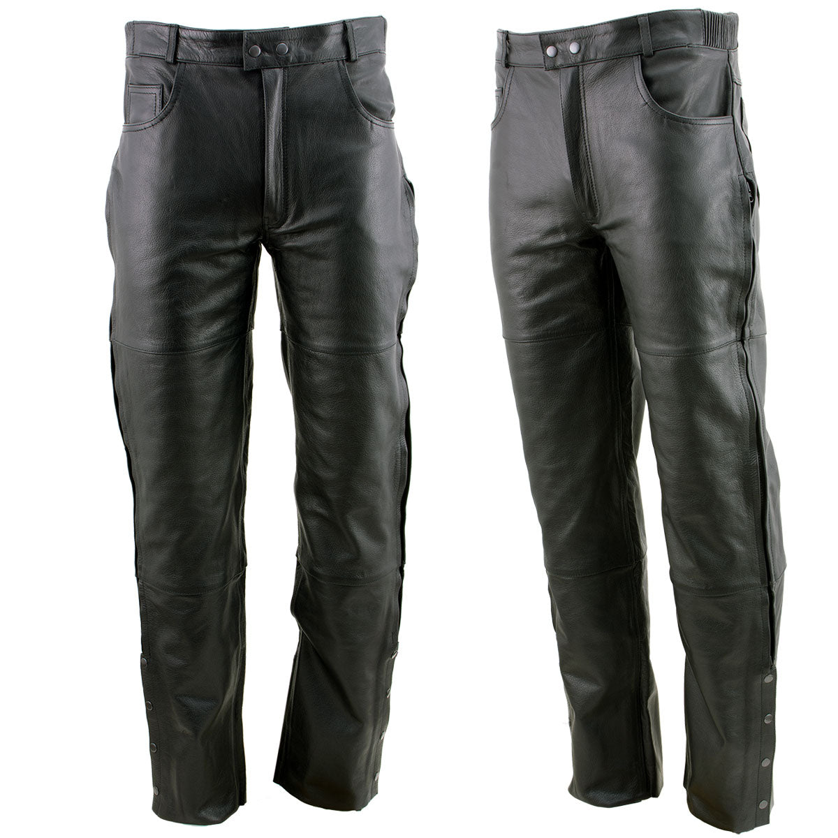 The Milwaukee Leather Premium Leather Motorcycle Over Pants with Side Zipper and Snap Closure, These Pants Are Made of Premium High Grade Cowhide Leather, Are Meant to Be Worn Over the Pants, They Come with Side Zippers and Snaps to Remove Easily. They Feature Jean Style 5 Pocket Design; Unfinished Hems, They Are Fully Lined So the Leather Does Not Stain the Pants, Elastic Comfort Sides on The Waist for A Comfortable Fit and A 2-Snap Button Front Closure with Front Fly Zipper.