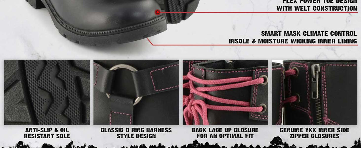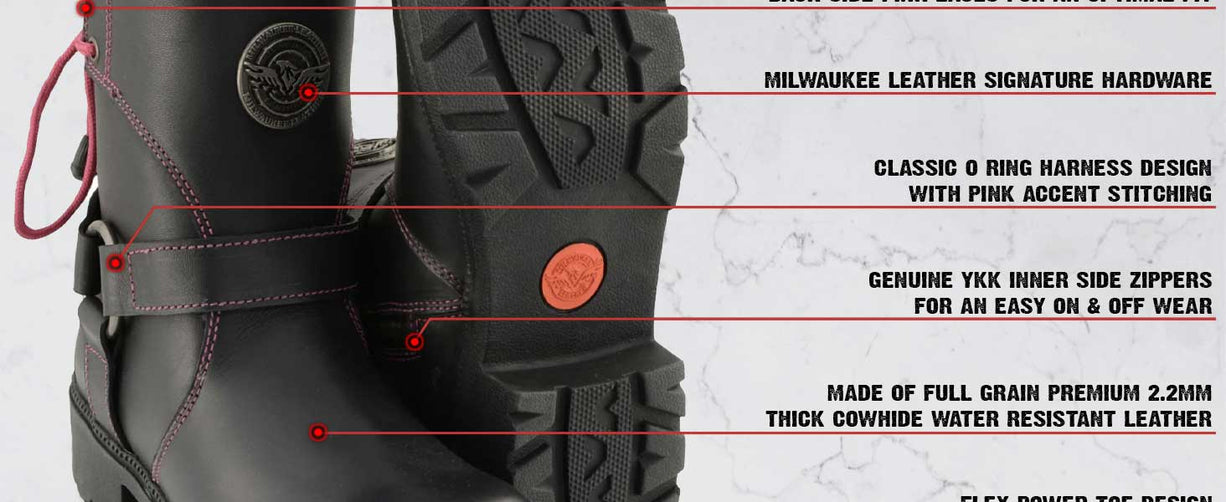 • Inside Zipper Closure with Adjustable Back Laces | These classic motorcycle boots for women feature a secure closure system with an inside side zipper for easy on and off wear, allowing you to easily put them on and ensure a secure fit for a confident bike ride. Adjustable back laces for an optimal snug fit. The women's riding boots boast the industry’s best YKK hardware, bearing Milwaukee’s Leather signature logo, along with a classic O-ring design.