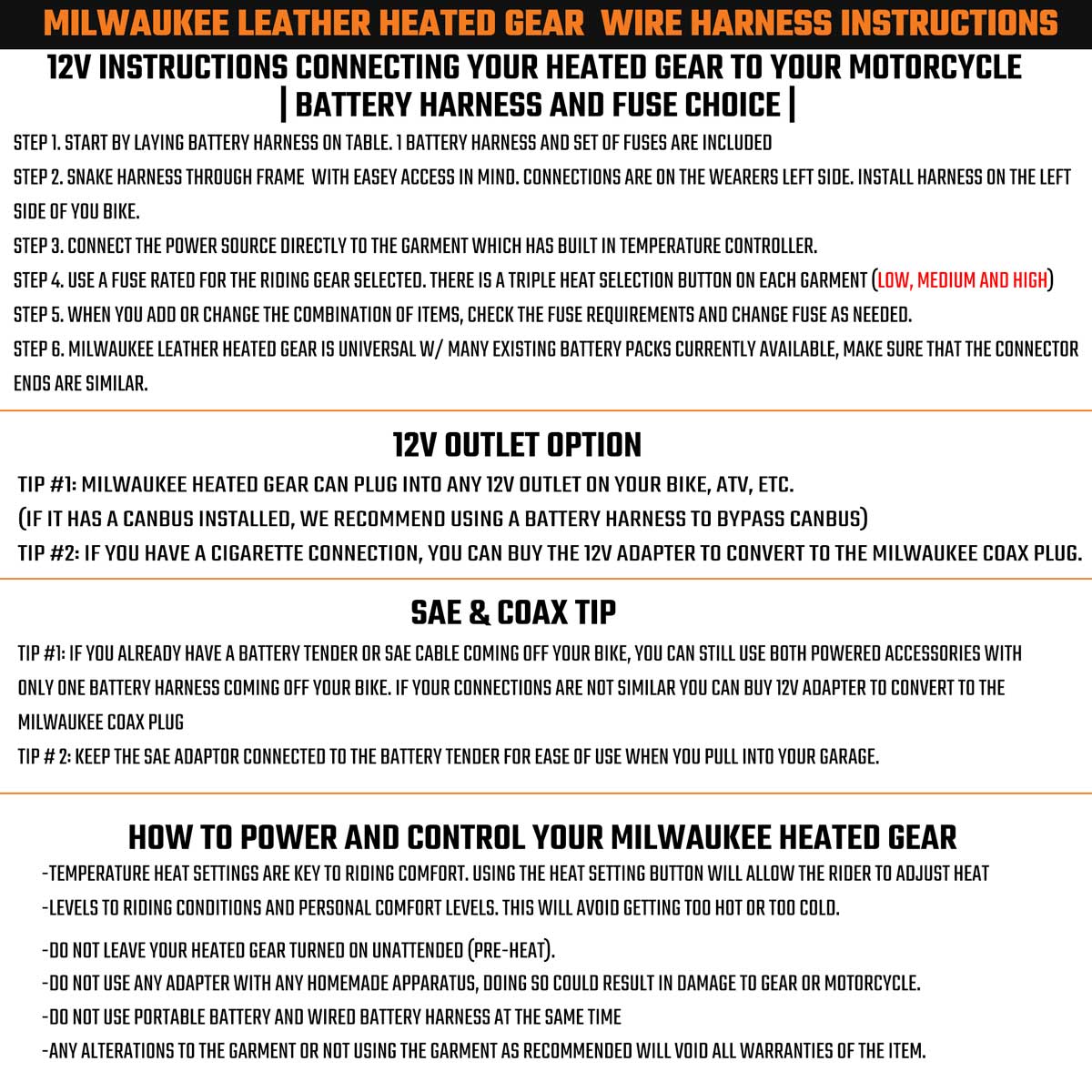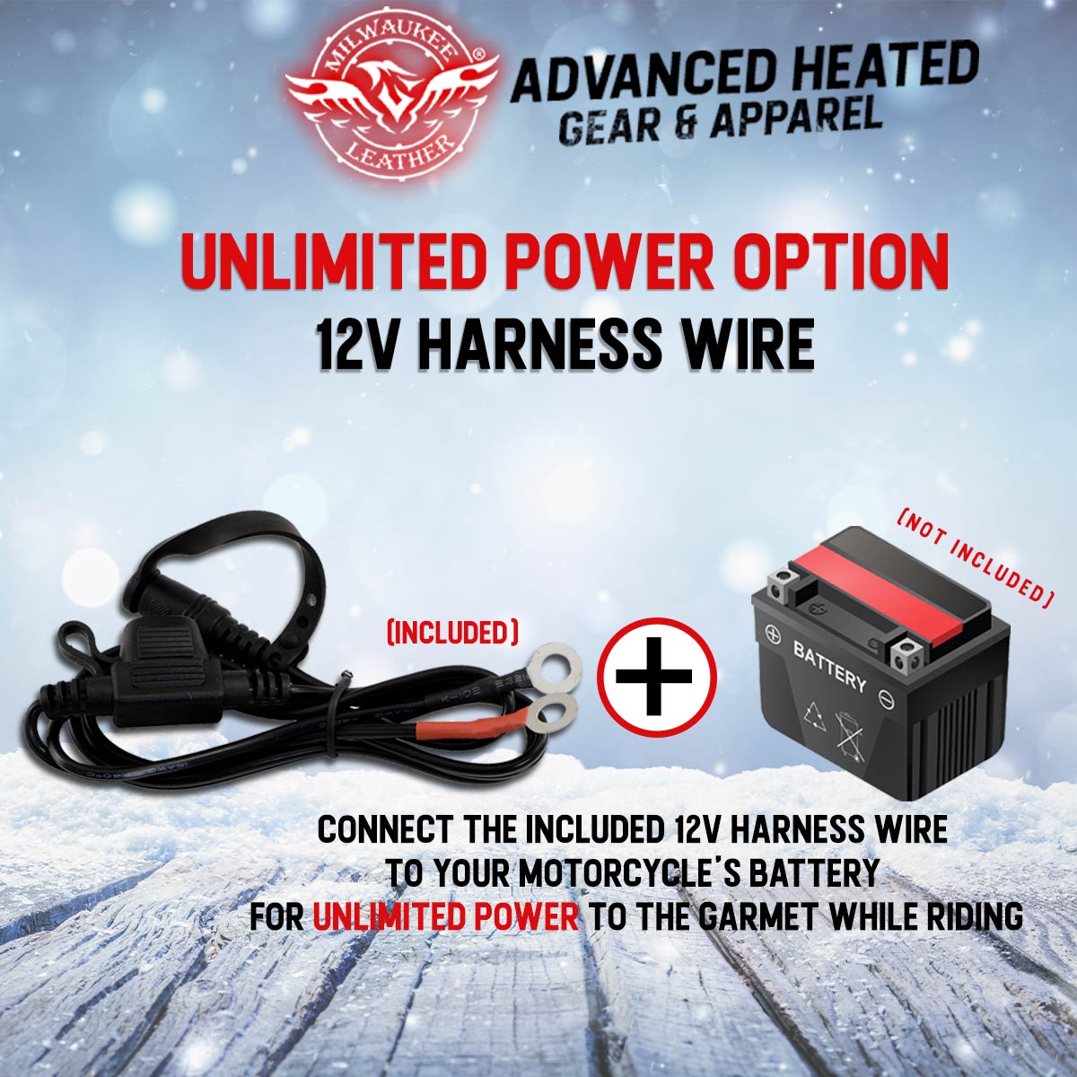 - POWER ON by Connecting to your Motorcycle’s Battery with the Included Battery Wire Harness or if You own a Milwaukee Leather Heated Jacket, You Can Connect It to the Battery Pack DOES NOT POWER ON WITH STANDALONE BATTERY PACK