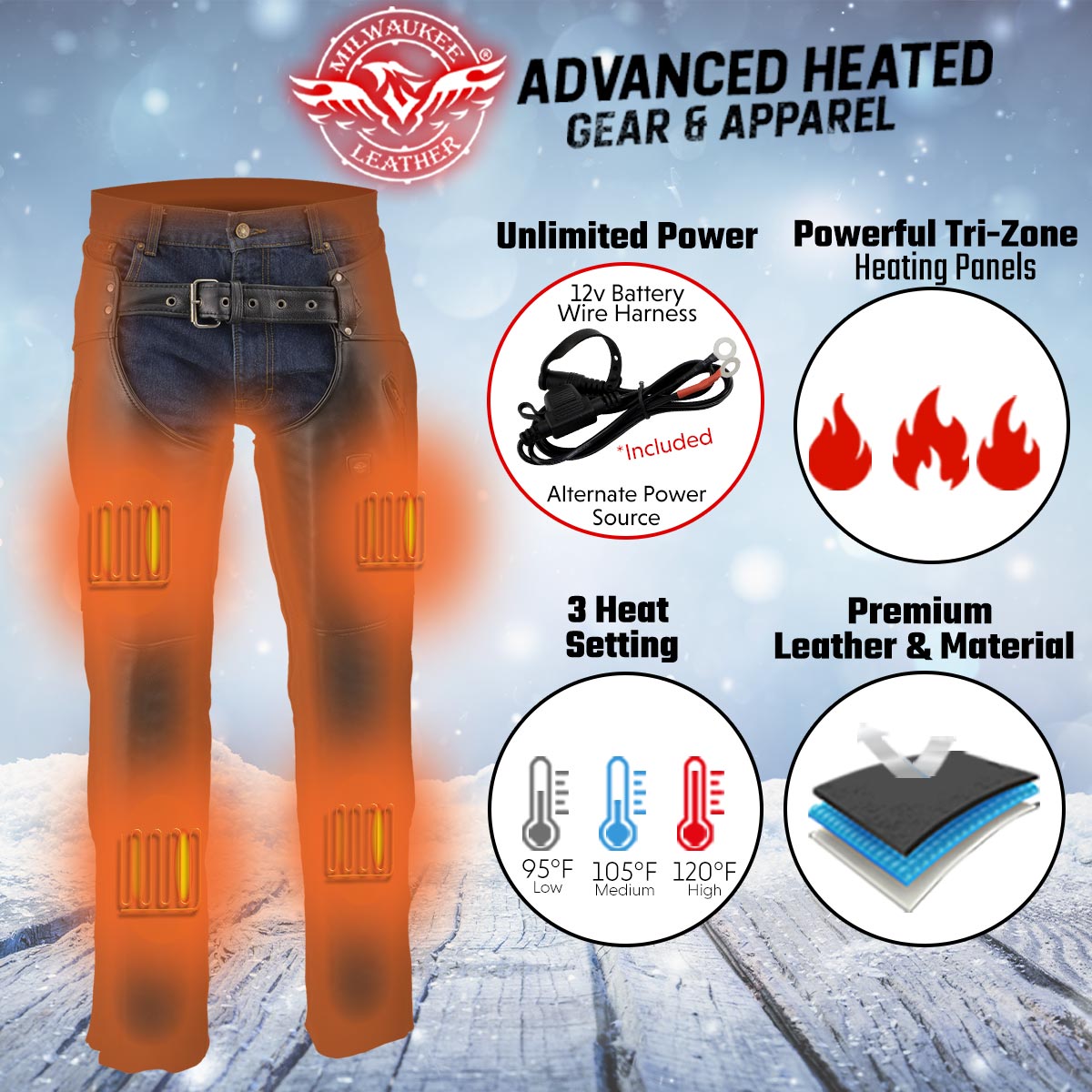 The Milwaukee Leather Men's Heated Leather Chaps Is the Ultimate in Heating Technology Designed for Riders Who Want to Enjoy Heat Either on Or Off the Motorcycle. Made of Premium Naked Cowhide 1.2-1.3mm, Combined with Heating Panels Intricately Placed to Deliver Plenty of Heat Where You Need It.
