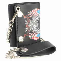 Milwaukee Leather MLW7837 Men's 4” Leather “Eagle w/ Flag” Tri-Fold Wallet w/ Anti-Theft Stainless Steel Chain