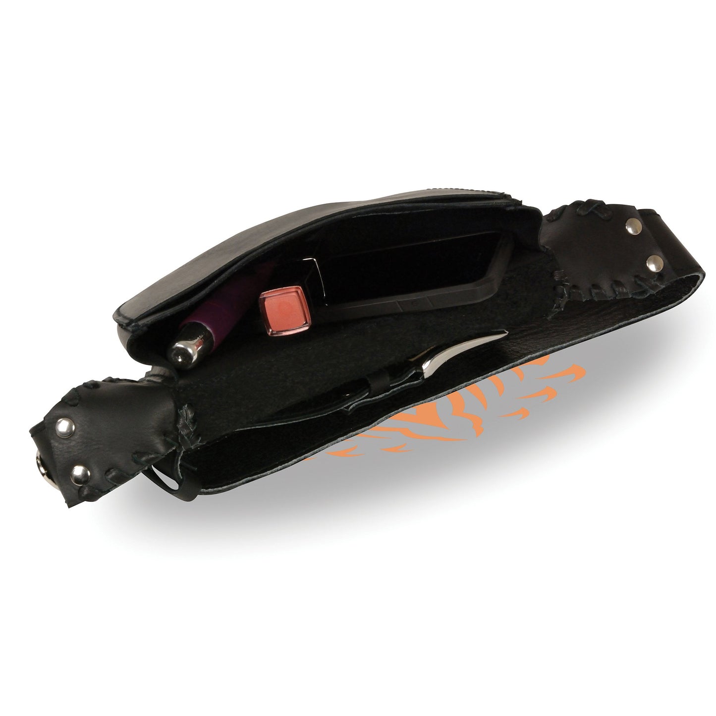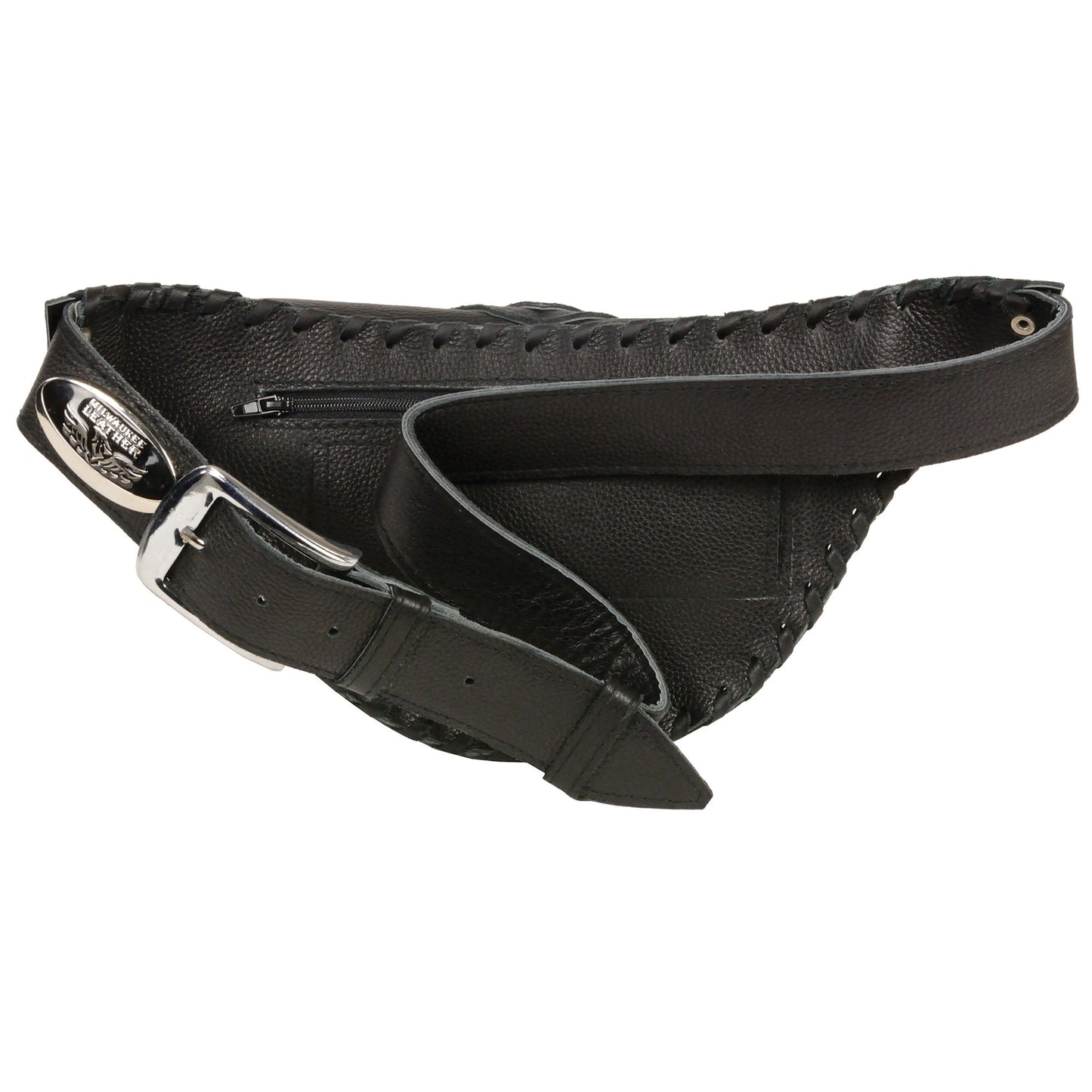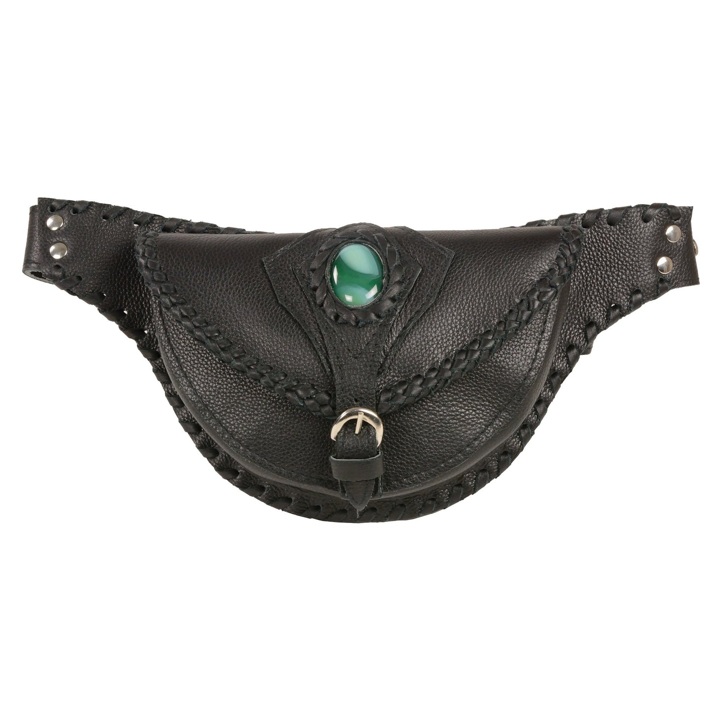Good quality, well made. Nice wide belt. Stone was burgundy, not turquoise but still nice. Allows me to carry with a couple zippers for ID and money. Only negative is overly large metal Milwaukee Leather logo that cannot be removed.