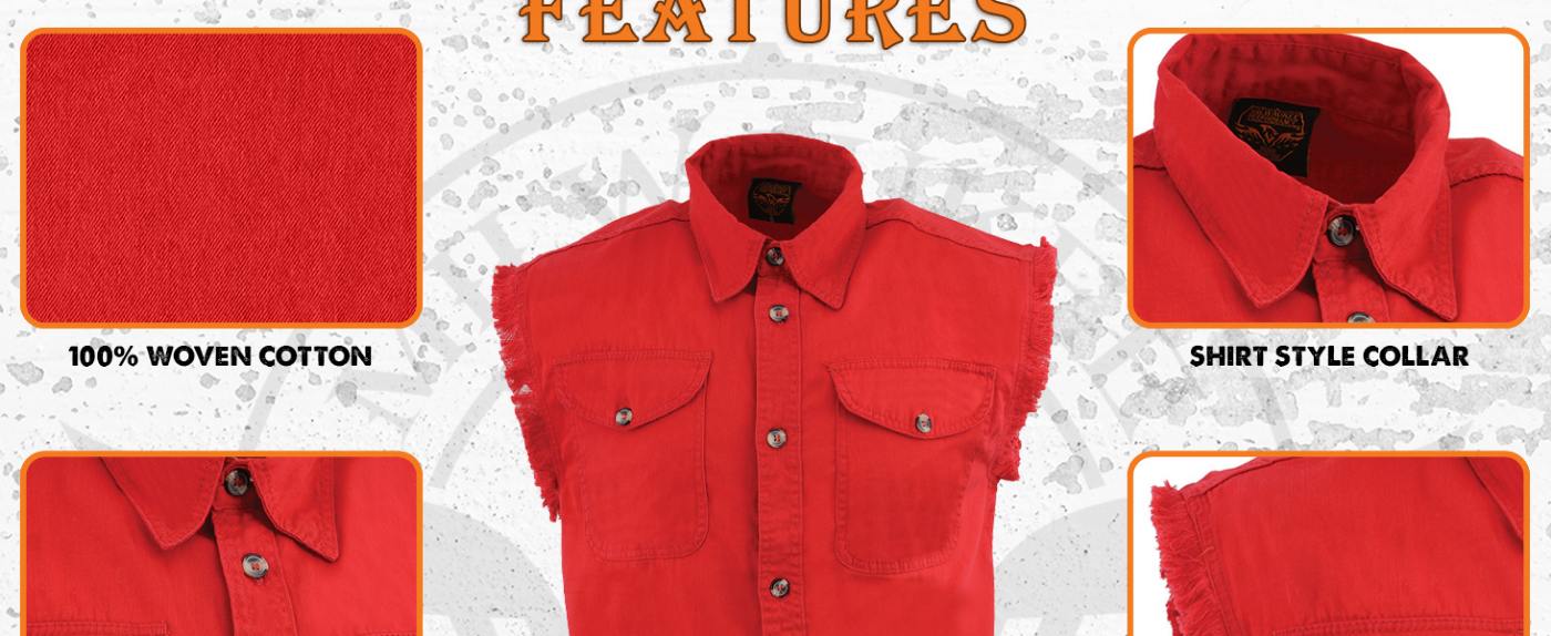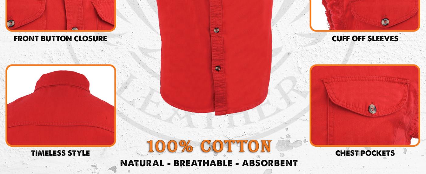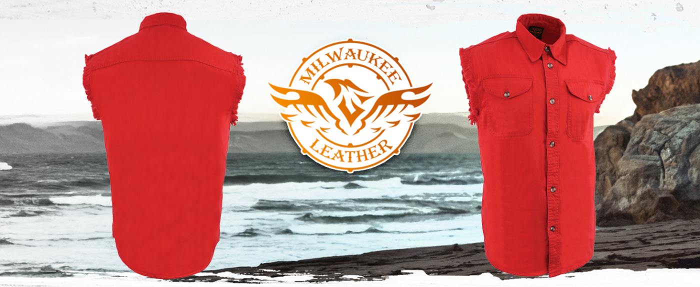 Milwaukee Leather DM4007 Men's Red Lightweight Denim Shirt with Frayed Cut Off Sleeveless
